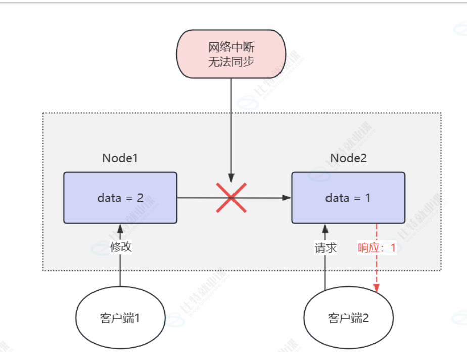 CAP理论认为CAP三个目标只能实现2个,所以要实现2个必须抛弃其他两个,但是网络问题在分布式数据库是必然会出现的问题,所以我们必须做出选择,抉择的时候到了,所以要么是CP,要么AP,要么是保证一致,当复制通道发生中断的时候,NODE1节点数据从1变成2,但是NODE2没有办法得知,所以NODE2还是1,所以当客户端请求数据的时候,需要返回ERROR,这个时候就无法对外提供服务了,保证了一致性,就无法保证可用性,比如银行这种强一致性的场景,钱扣掉宁可不提供服务,也不可以提供错误的数据。