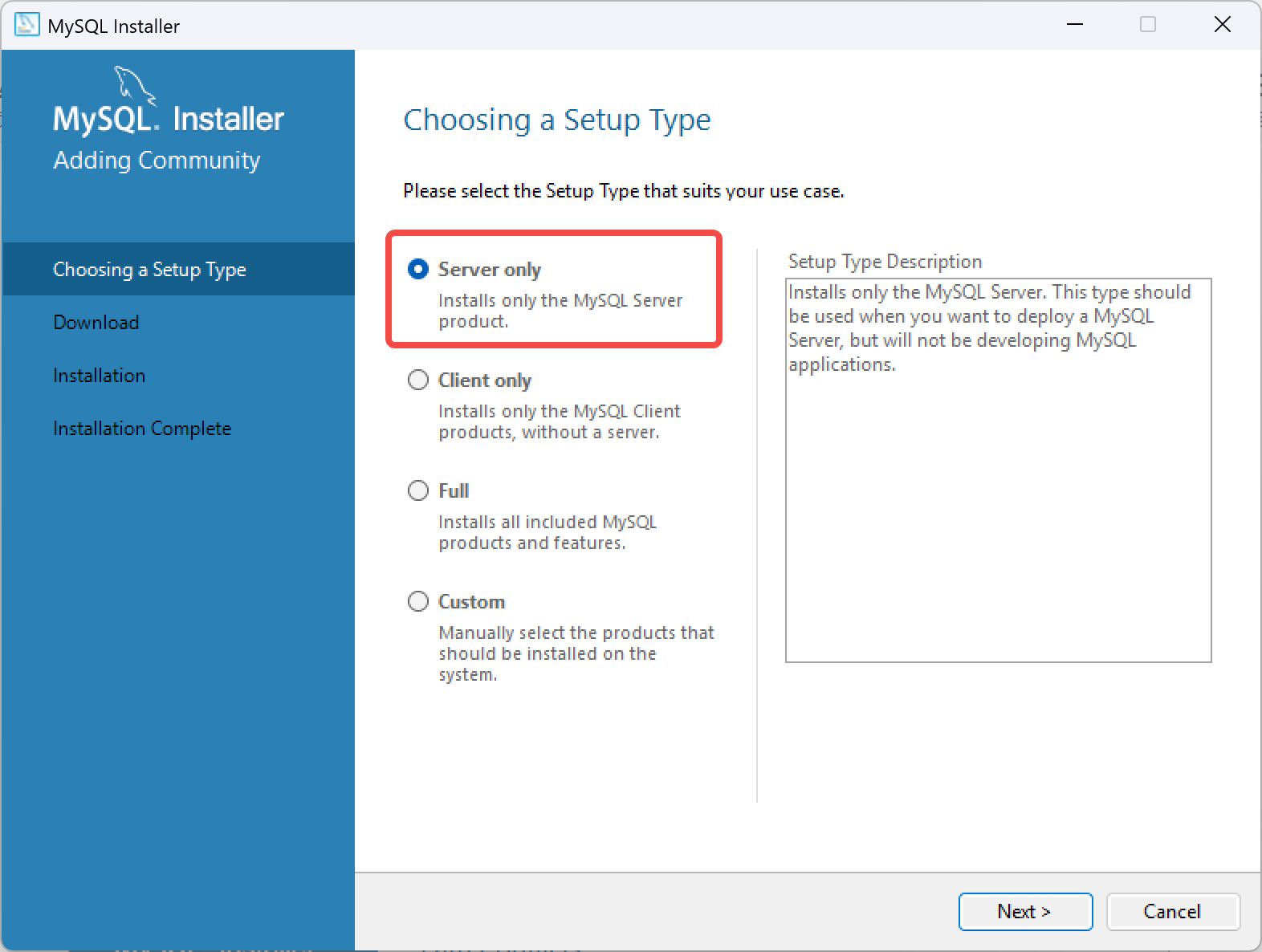 只安装 MySQL 数据库引擎(Server),不安装任何操作界面、命令行工具或开发接口