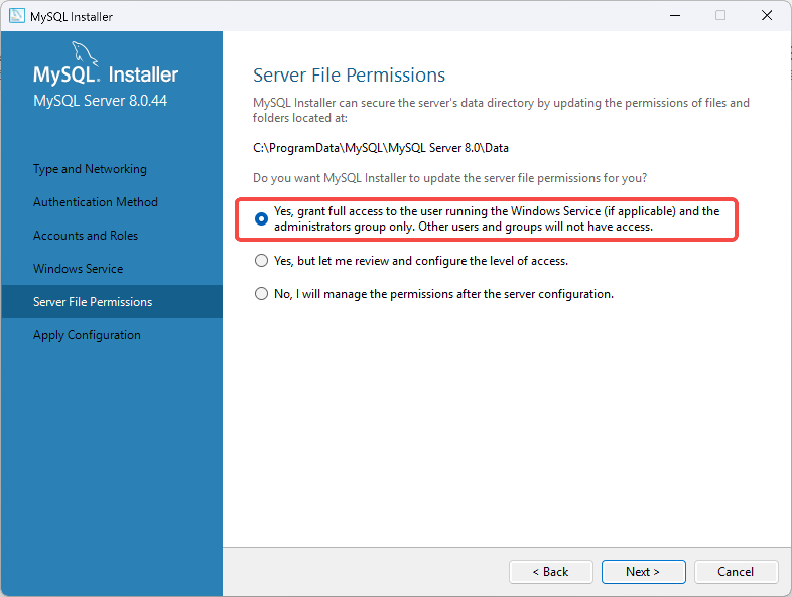 这个界面是在问你:要不要把存放数据的文件夹锁起来,只让 MySQL 自己和管理员能碰?