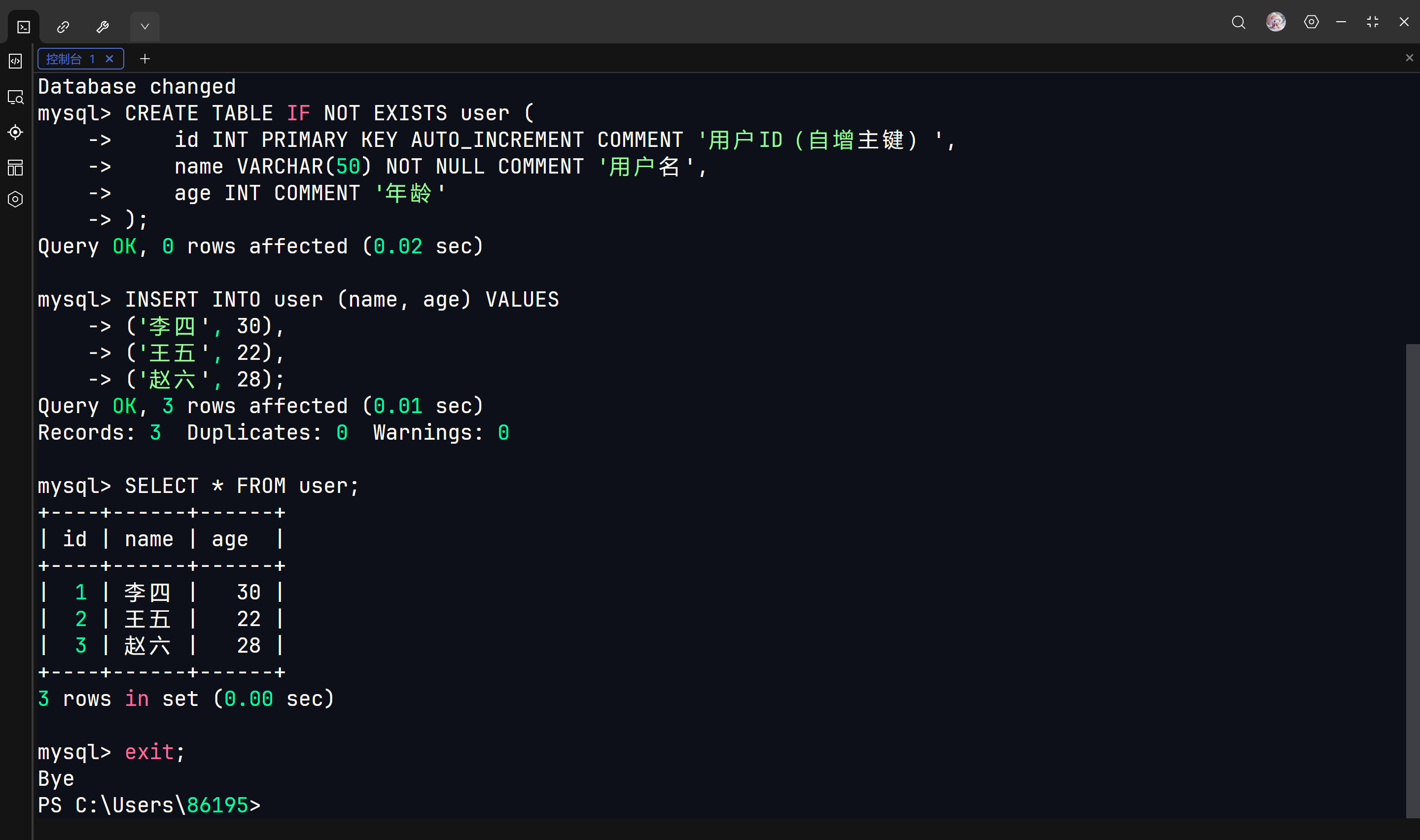 id INT PRIMARY KEY AUTO_INCREMENT COMMENT '用户ID(自增主键)',