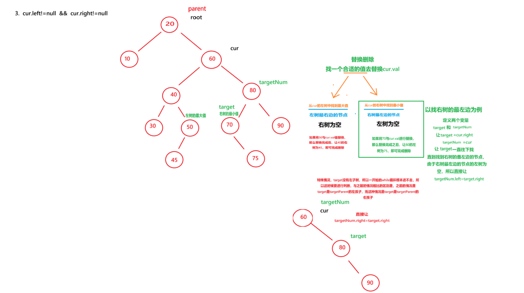 当targetNum.left为空的时候,循环根本就进不去,然后执行 targetNum.left=target.right 的时候,就会出现空指针异常,所以我们要进行判断,判断 targetNum.right==target,如果成立,则我们需要将targetNum.right=target.right