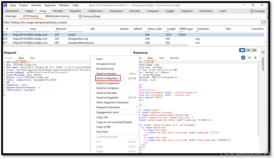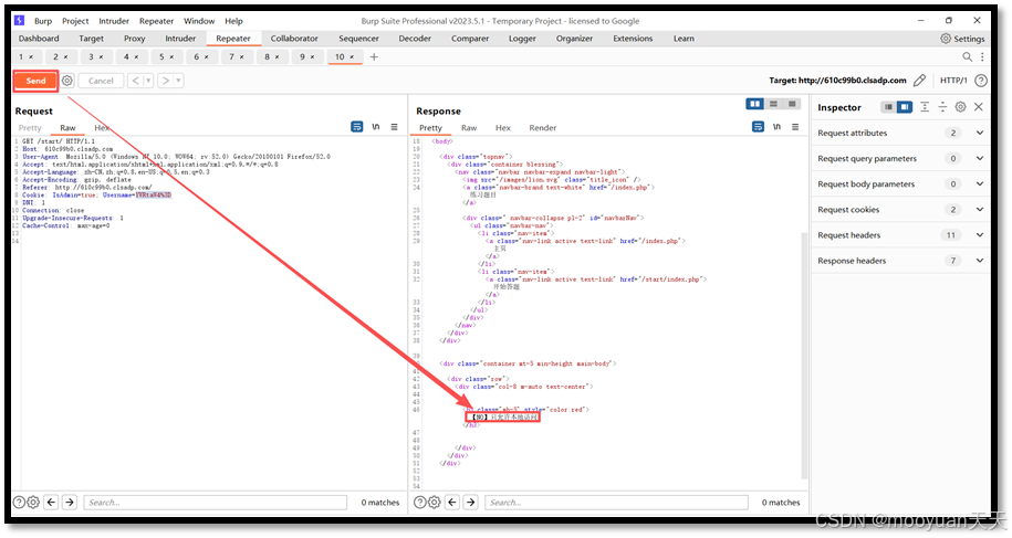 在burpsuite中找到此请求报文,将其发送到repeater模块,如下所示。