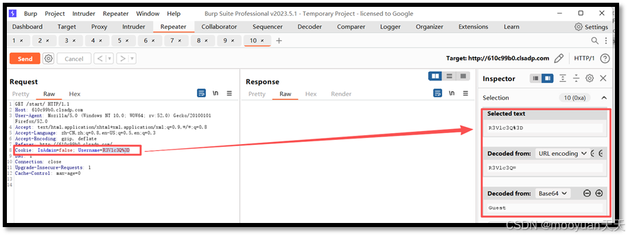 发送到repeater后报文如下所示,下图中左边红框内容就是我们需要替换的,关注右边红框就是与我们分析一致,解密后为Guest。