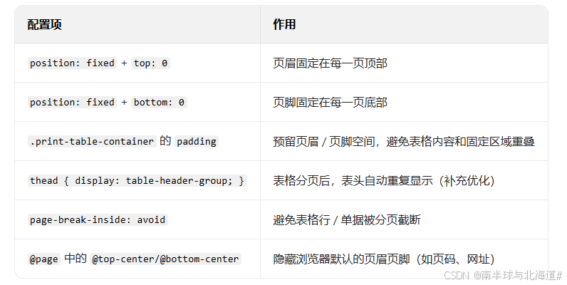 3)表格行用page-break-inside: avoid 防止行被截断,表格超出时自动分页;