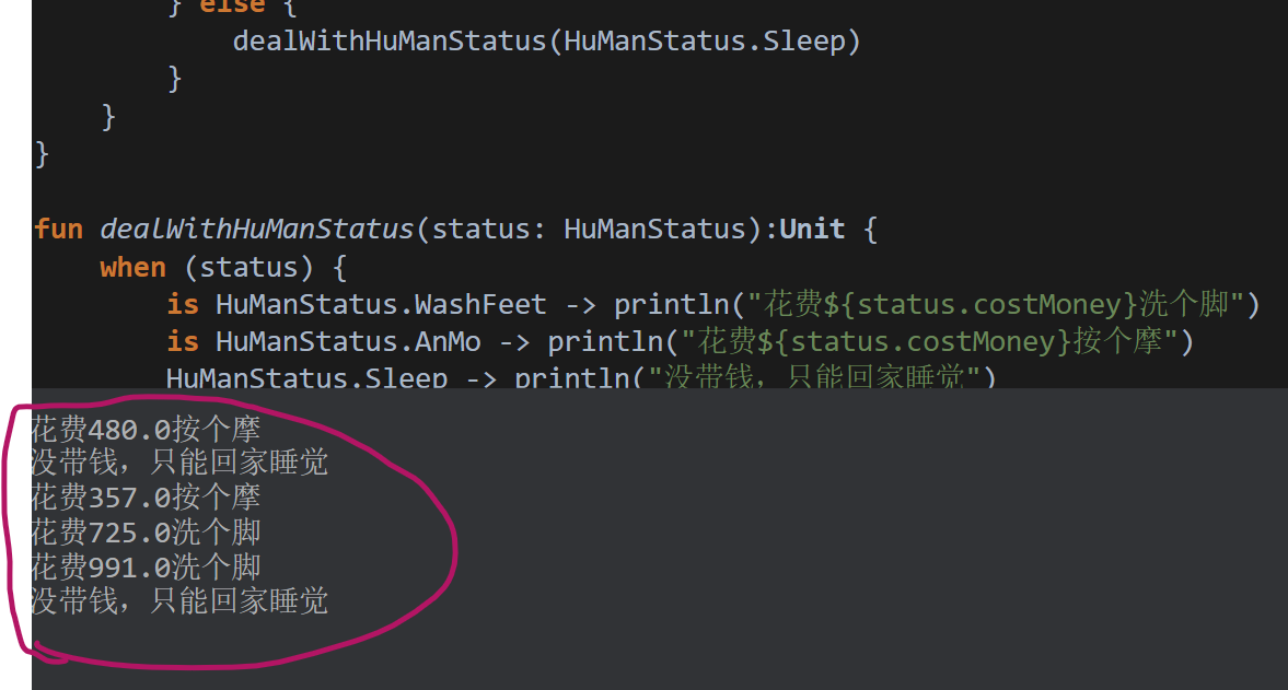 HuManStatus.Sleep -> println("没带钱,只能回家睡觉")