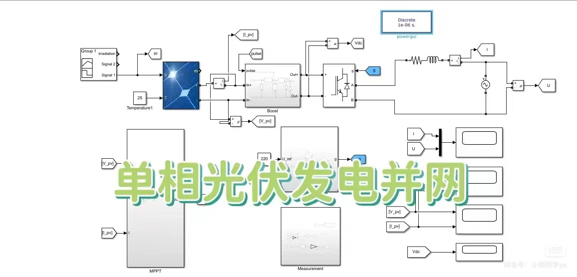 单相/三相光伏发电并网/离网simlink仿真(MPPT)或是大功率VSC 最大功率点追踪算法(MPPT)仿真模型, 有基于扰动观察法(P&O),恒压算法,电导增量法,变步长扰动 等最大功率点跟踪算法追踪光伏电池的发电曲线,实现最大功率点追踪输出的仿真模型。 目前有两种:1.单级结构的仿真 1.1光伏电池+Buck电路 1.2光伏电池+Boost电路 2.或是两极结构 2.1光伏电池+Buck电路+全桥逆变(任意mppt算法) 2.2光伏电池+Boost电路+全桥逆变(任意mppt算法) 2.3离网三相光伏发电仿真 2.4基于VSC控制的三相大功率发电并网 有相关的基本原理参考资料哦! 以下为其基本电路图和相应各个部分的波形图。 任意参数可调!