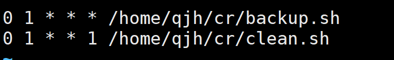 0 1 * * * /home/qjh/cr/backup.sh #每天01:00执行backup.sh 即数据备份