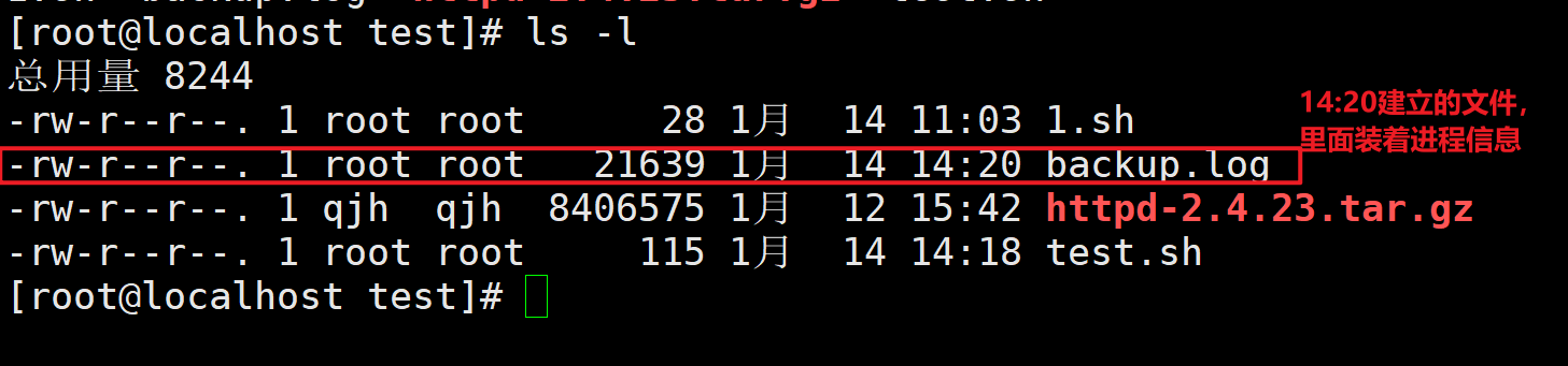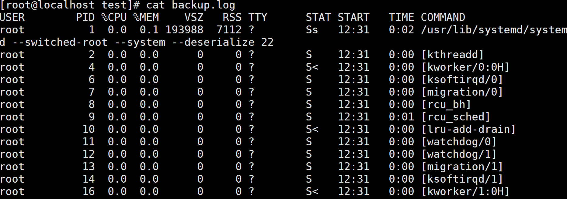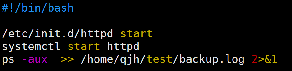 ps -aux >> /home/qjh/test/backup.log 2>&1 //将进程信息输出到 /home/qjh/test的backup.log