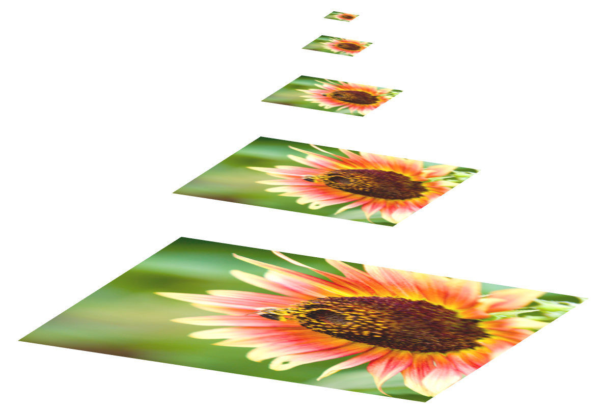 图像金字塔是由一幅图像的多个不同分辨率的子图所构成的图像集合(如下图所示)。该组图像是由单个图像通过不断地降采样所产生的,最小的图像可能仅仅有一个像素点。