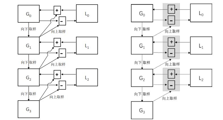 拉普拉斯金字塔的作用在于,能够恢复高分辨率的图像。下图演示了如何通过拉普拉斯金字塔恢复高分辨率图像。其中,右图是对左图的简化。
