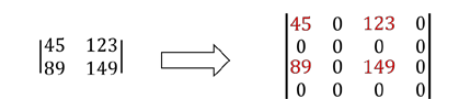 首先对像素点以补零的方式完成插值。通常是在每列像素点的右侧插入值为零的列,在每行像素点的下方插入值为零的行。如下图所示:左侧是要进行向上采样的 4 个像素点,右侧是向上采样时进行补零后的处理结果。