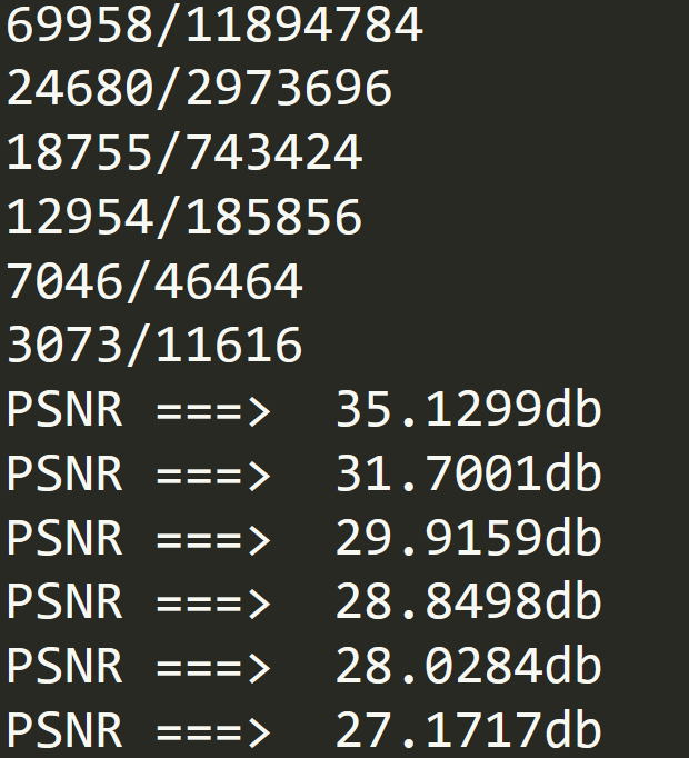 下图是阈值为 6 时,每个尺度的拉普拉斯金字塔保留的点的比例,和信息损失,可见,在高分辨率下,PSNR 可以达到 41.5db,肉眼上其实看不大出来