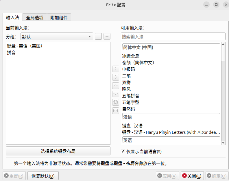 点击系统右上角的输入法图标,在下拉菜单中选择"配置",将拼音添加到左侧