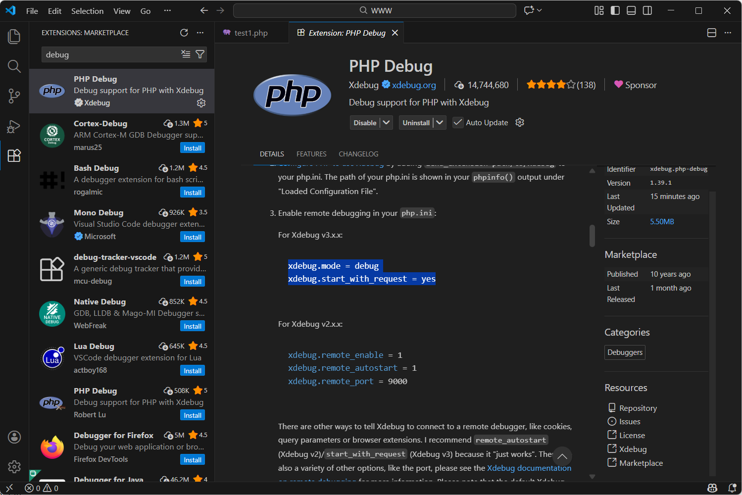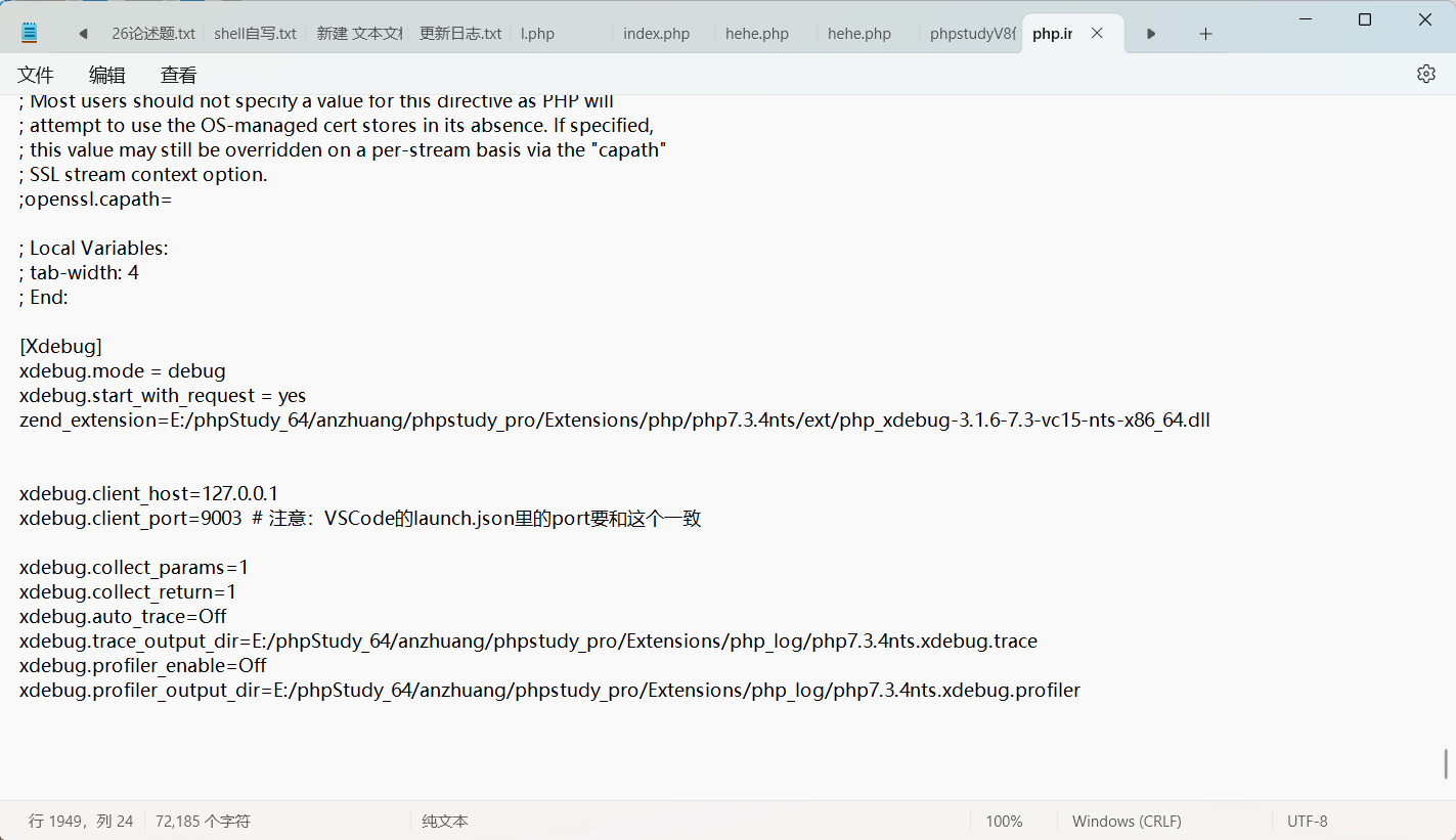 xdebug.mode = debug xdebug.start_with_request = yes zend_extension=D:/phpstudy_pro/Extensions/php/php7.3.4nts/ext/php_xdebug-3.1.6-7.3-vc15-nts-x86_64.dll -