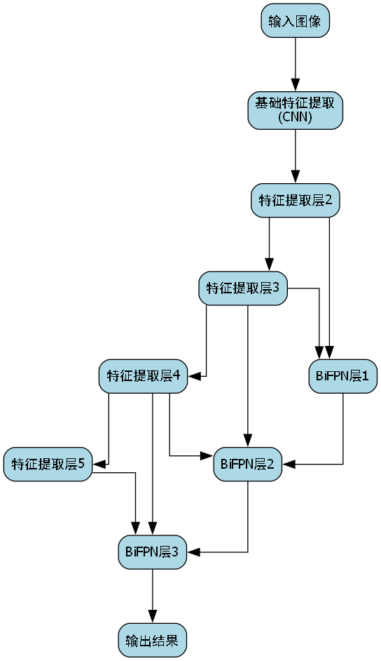 BiFPN(Bidirectional Feature Pyramid Network)是特征金字塔网络的重要改进版本,其核心创新在于双向连接和可学习权重机制。相比传统FPN的单向连接,BiFPN采用双向连接,能够更好地融合不同尺度的特征信息。