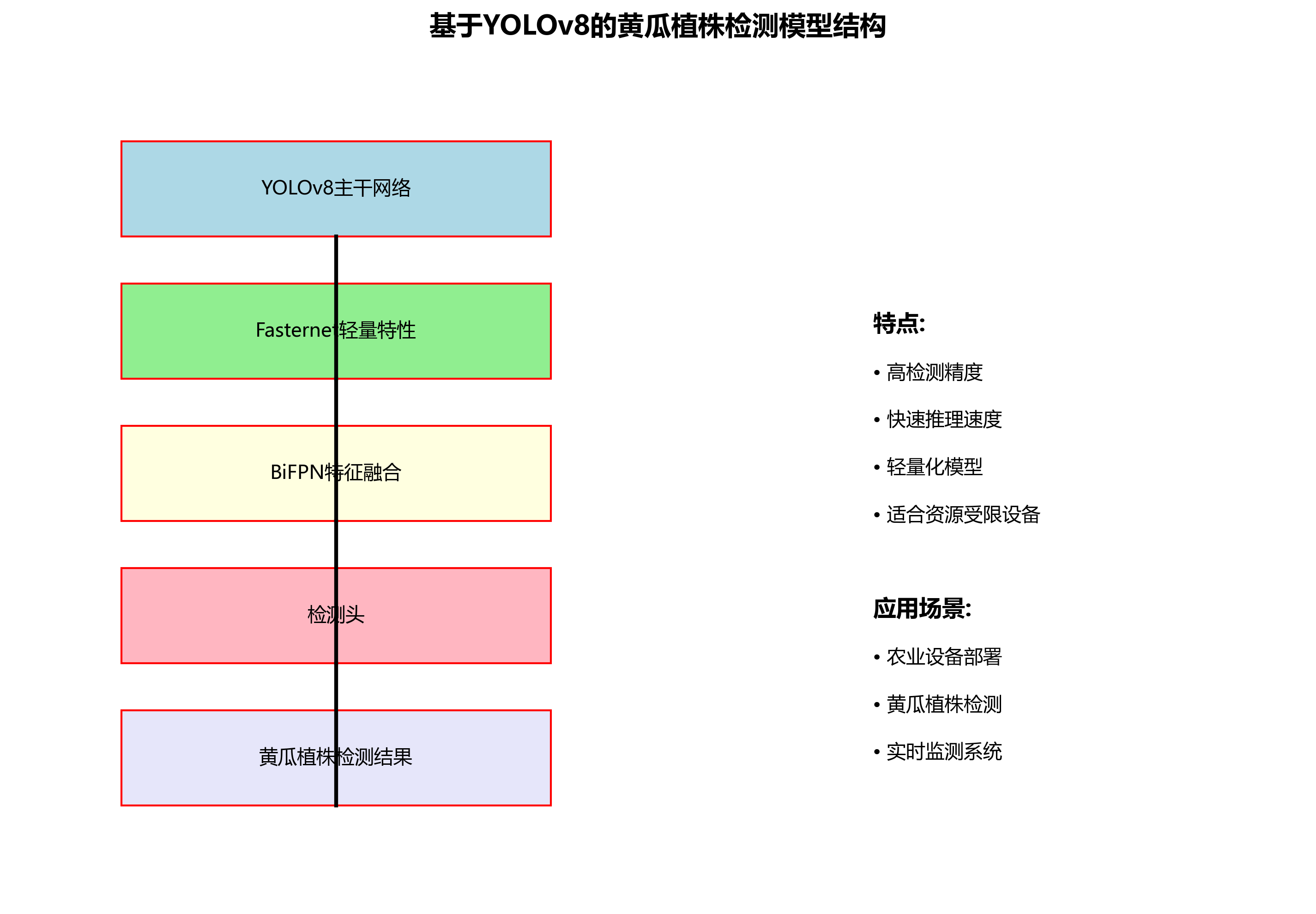 针对这些挑战,我们提出了一种基于YOLOv8的改进方案,结合Fasternet的轻量特性和BiFPN的特征融合能力,构建了一个高效准确的黄瓜植株检测模型。这一方案不仅考虑了检测精度,还兼顾了推理速度,适合在资源受限的农业设备上部署。