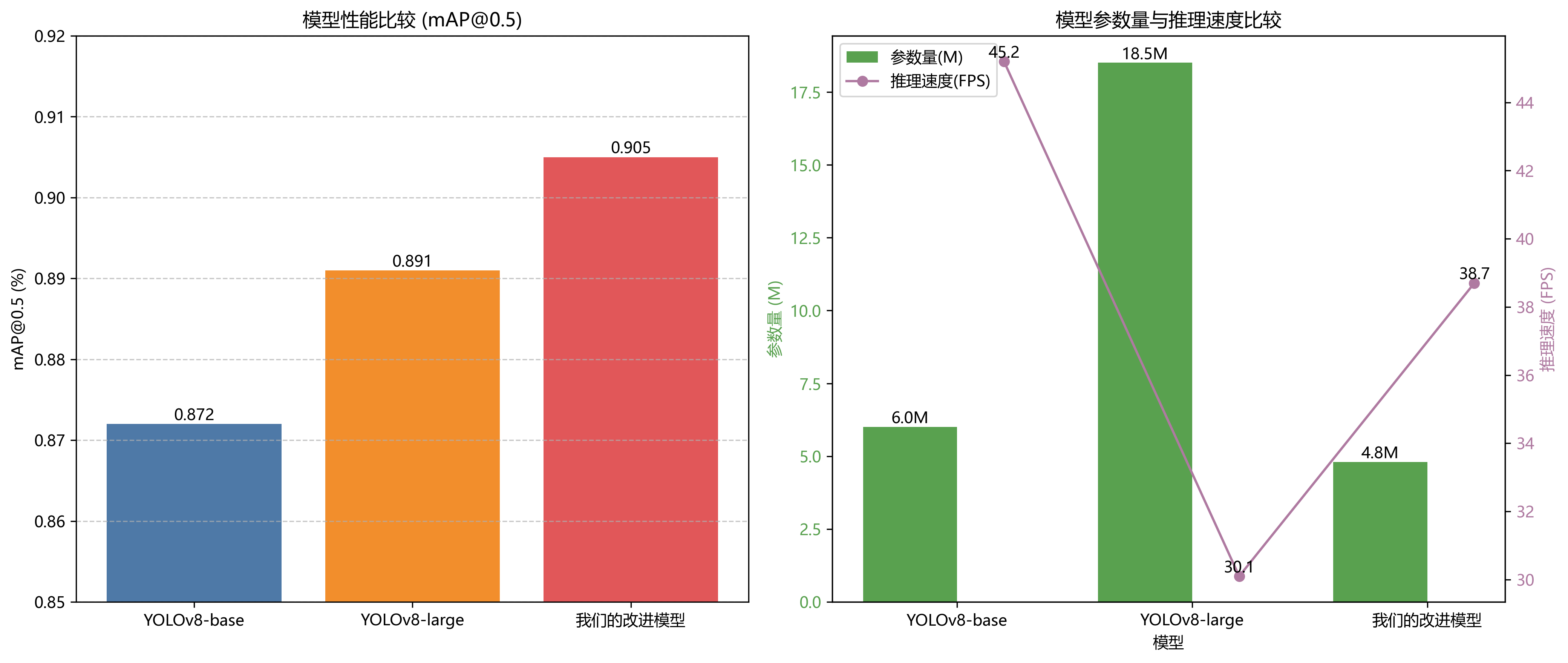 | 模型 | mAP@0.5 | 参数量(M) | 推理速度(FPS) |