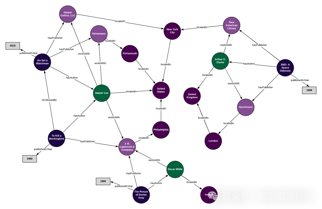 当我们将所有关于《杀死一只知更鸟》的个体信息添加到本体论框架中时,我们就初步构建了一个知识图谱的一部分。如果将所有数据(包括多本书、作者、出版社和地点)都以类似方式编码,我们最终会得到一个完整的知识图谱。这一图谱以本体论为结构,将所有个体数据点以关系的网状形式连接起来。