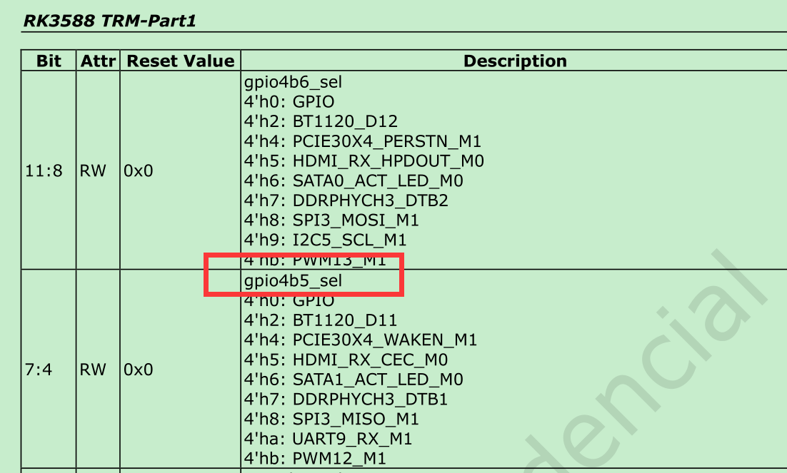 BUS_IOC_GPIO4B_IOMUX_H寄存器总共32位,高16位都是使能位,控制低16位的写使能,低16位对应4个引脚,每个引脚占用4bits,不同的值引脚复用为不同功能, 如GPIO4_B5引脚,控制该引脚复位功能的[7:4]位,都为0时,复用为GPIO功能,而系统复位默认为0,本实验中可以不进行配置。 如果需要复用为PWM功能就要将[7:4]位设置为1011,也就是将第7bit位 第5bit位 第4bit位设置为1,因为高16位控制对应低16位写使能,所以需要将第7+16bit 第5+16bit 第4+16bit设置为1,即第23bit 21bit 和20bit设置为1 从而才能对其进行写操作。