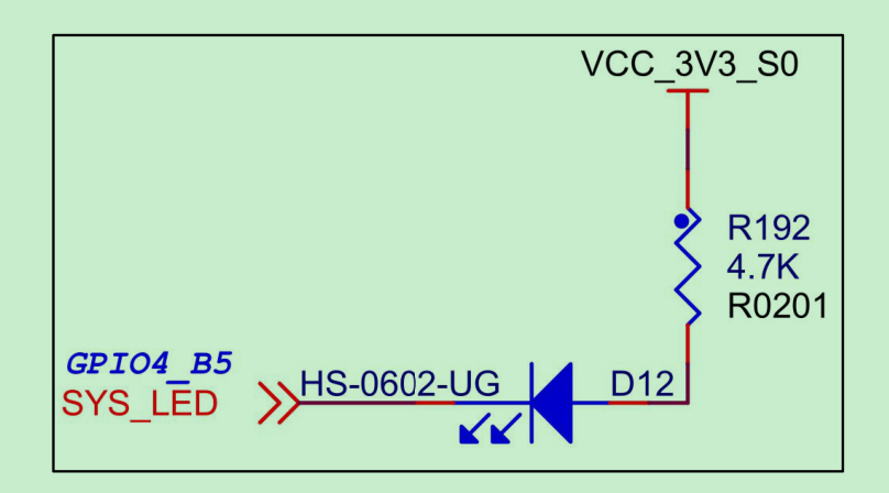电源指示灯在上电后为红色常亮,表示电源在稳定运行。系统状态指示灯为绿色 LED,当系统正常开机后,状态指示灯会进入心跳模式,即一个周期闪烁两次,同时该指示灯为可编程控制指示灯,用户也可以自行控制 GPIO4_B5 引脚,实现对该指示灯进行控制