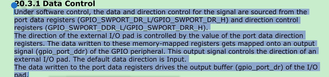 在软件控制下,信号的数据与方向控制分别来自端口数据寄存器 (GPIO SWPORT DR L/ GPIO SWPORT DR H)和方向控制寄存器(GPIO SWPORT DDR L/ GPIO SWPORT DDR H)