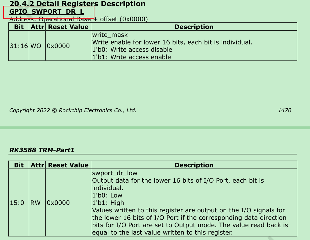 以GPIO_SWPORT_DDR_L寄存器说明,该寄存器有高16bit和低16bit,高16bit控制低16bit的写使能,低16bit控制GPIO的输出方向,GPIO_SWPORT_DDR_H同理。 如果要将GPIO4_B5设置为输出模式,那么就要写GPIO_SWPORT_DDR_L寄存器,因为B5属于GPIO4中A-D组总计64个引脚中的低32引脚范围,所以需要将GPIO_SWPORT_DDR_L寄存器的第13bit位和13+16bit位置1。