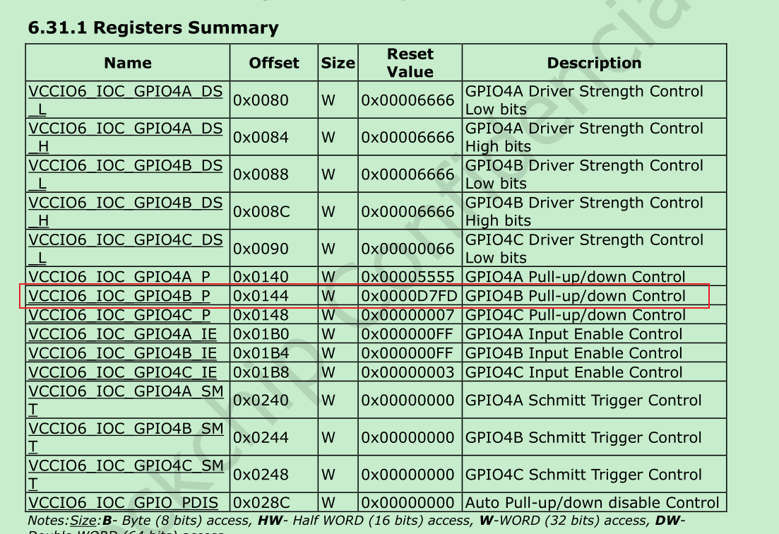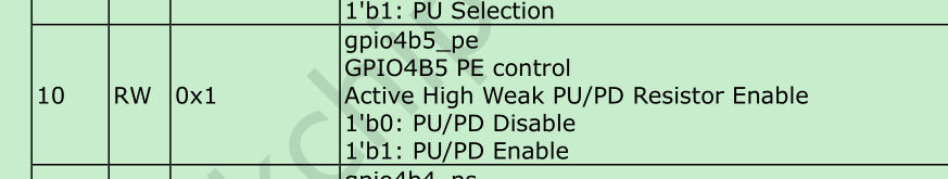 VCCIO6_IOC_GPIO4B_P 寄存器有高16bit和低16bit,高16bit控制低16bit的写使能,低16bit控制GPIO的上下拉配置。 如果要将GPIO4_B5设置为上拉模式那么就将VCCIO6_IOC_GPIO4B_P 寄存器的第10bit位设置为1
