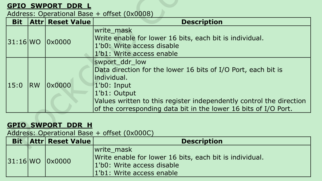 - GPIO_SWPORT_DDR_L:低位引脚数据方向寄存器,控制输入或者输出。