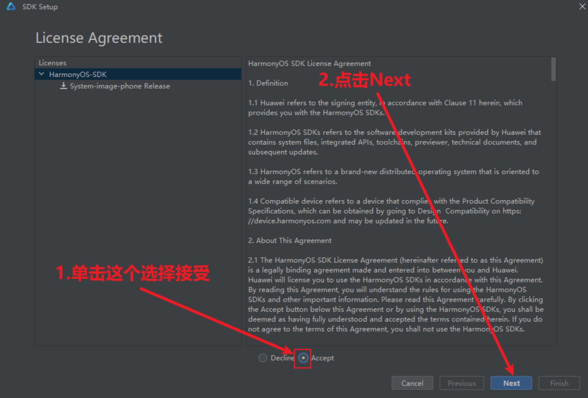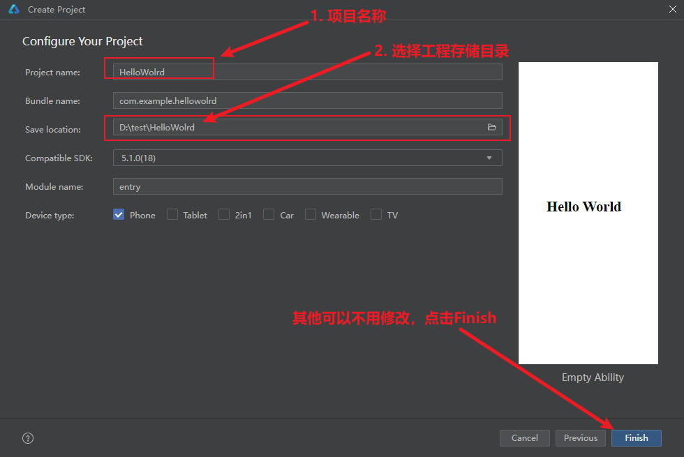 注意存储路径不能包含中文字符 - 选择 Compile SDK(应用/服务的目标 API Version),在编译构建时DevEco Studio 会根据指定的 Compile API 版本进行编译打包;这里选择默认即可