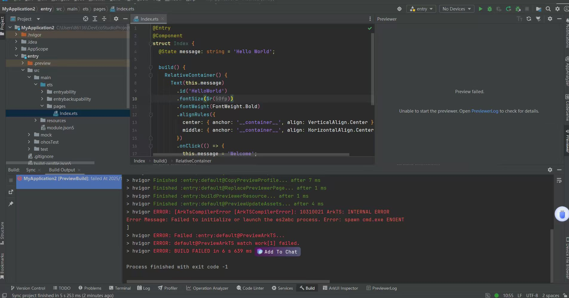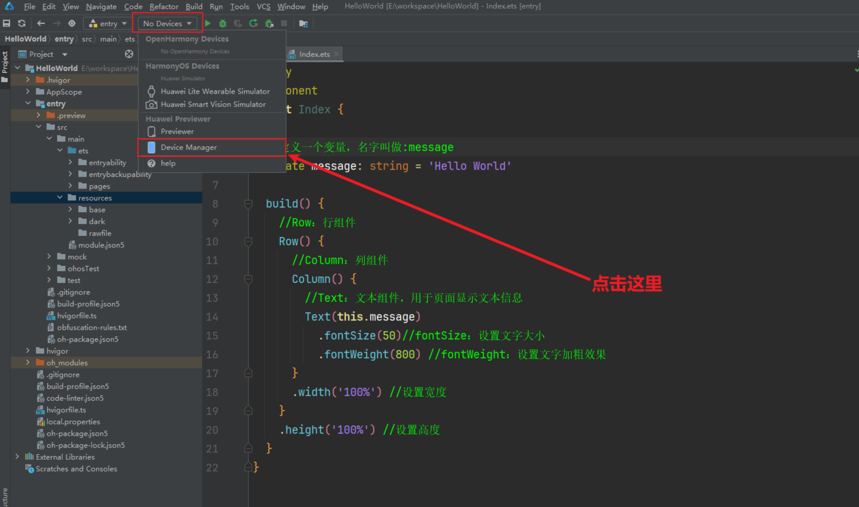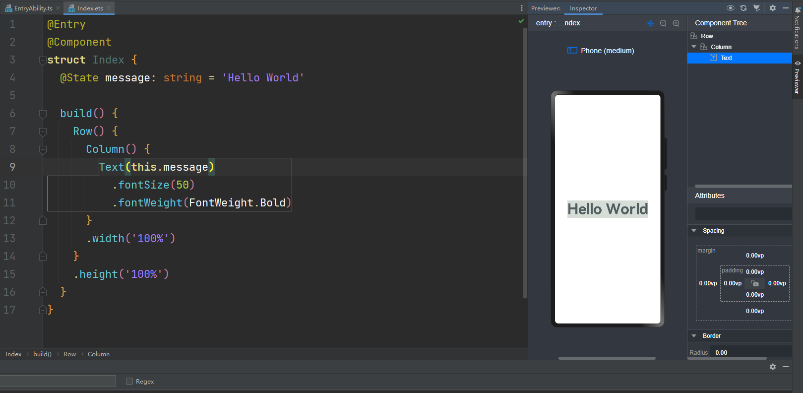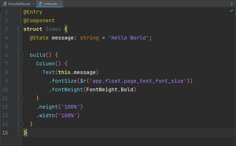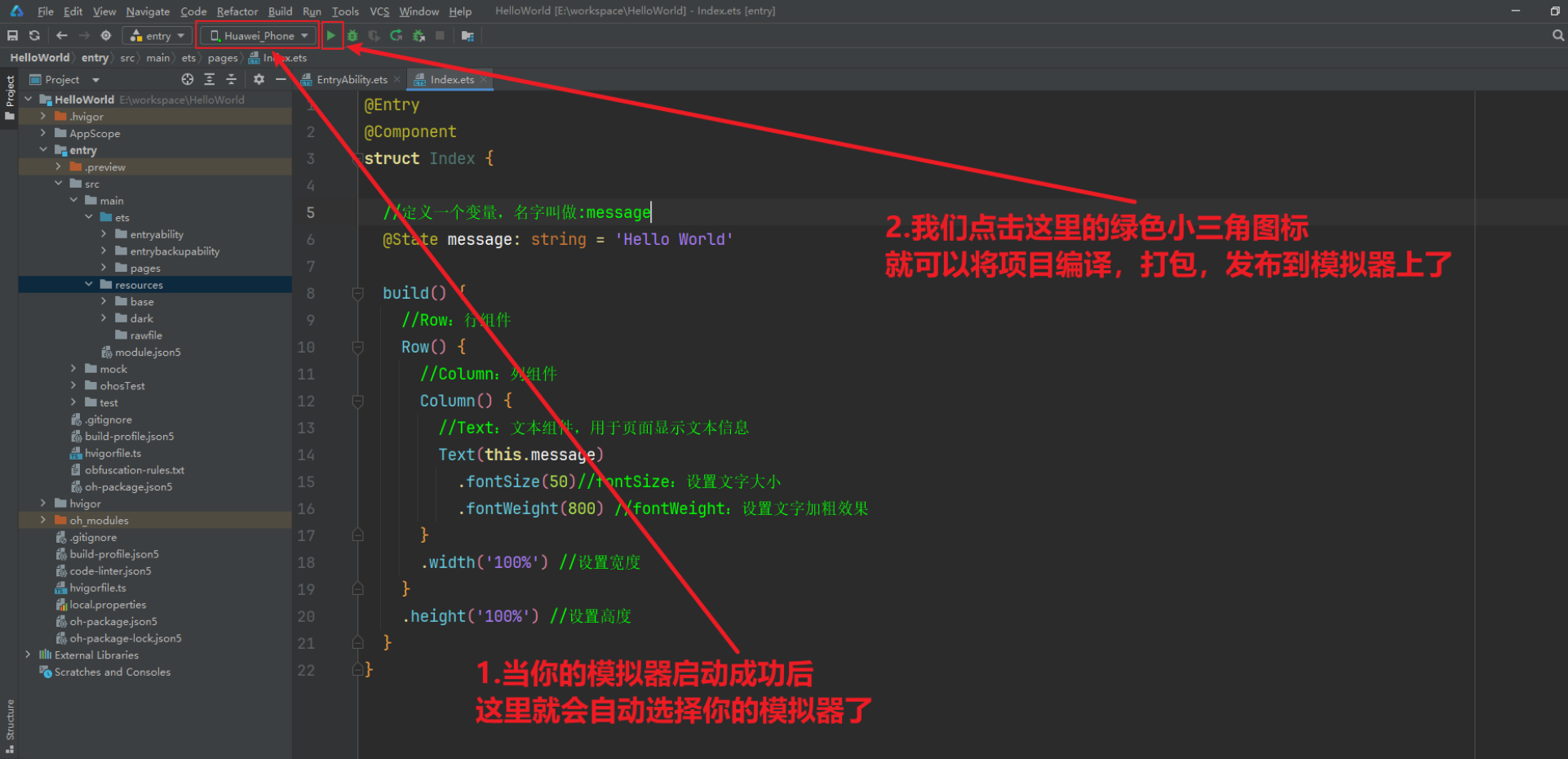 - @Entry:用来标记当前组件是一个入口组件,也就是说这个组件是可以独立被访问的