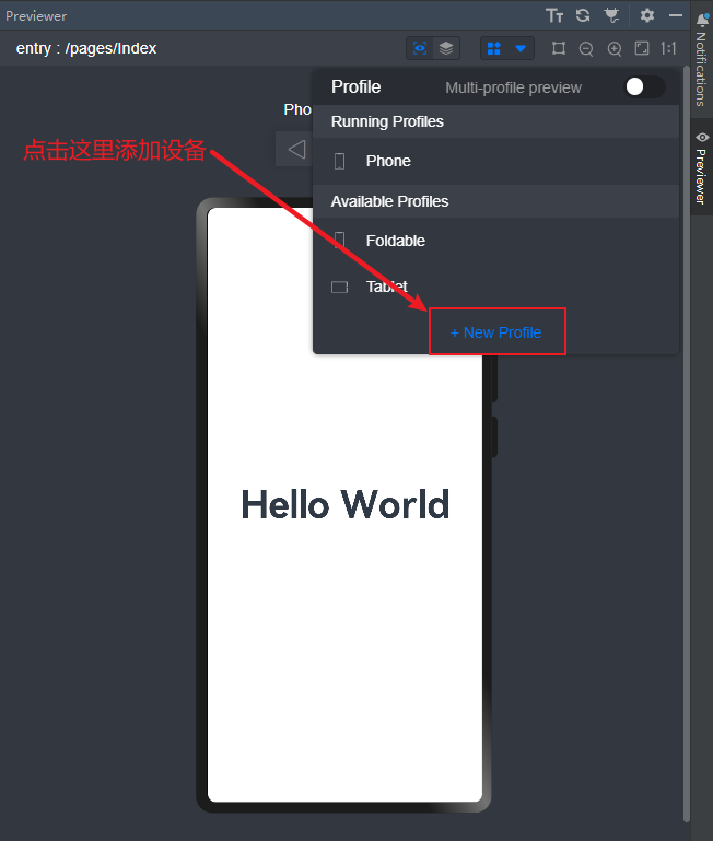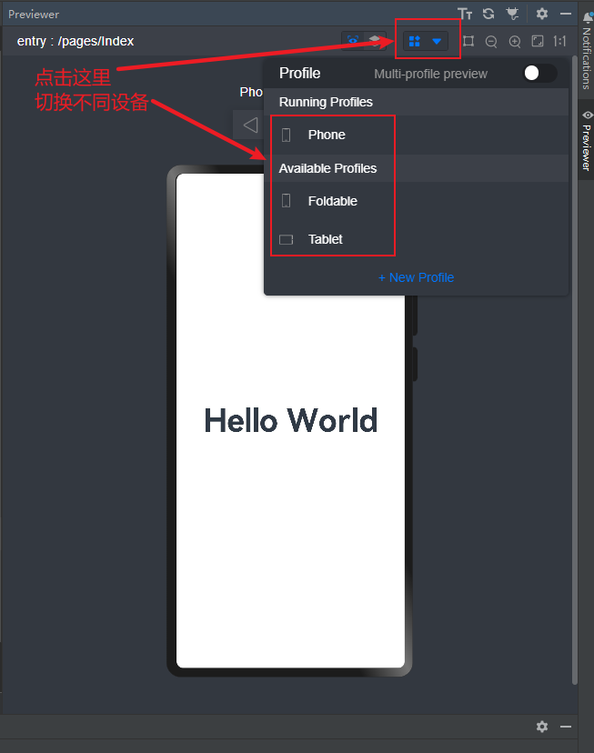 定义设备后,可以在 Previewer 右上角,单击如下按钮,打开 Profile 管理器,切换预览设备
