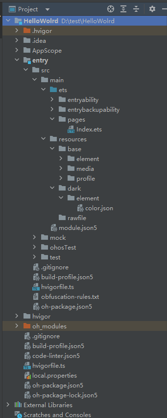 上面步骤中,ArkTS工程创建完毕后,工程目录结构是这样的: