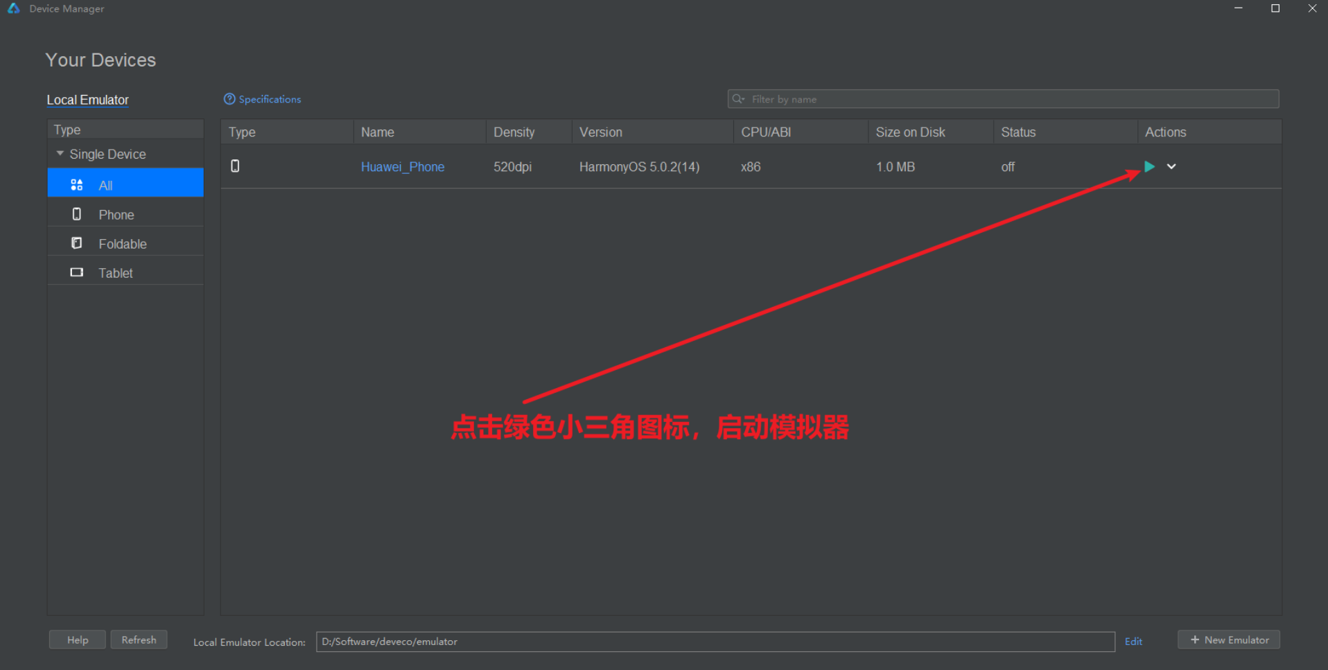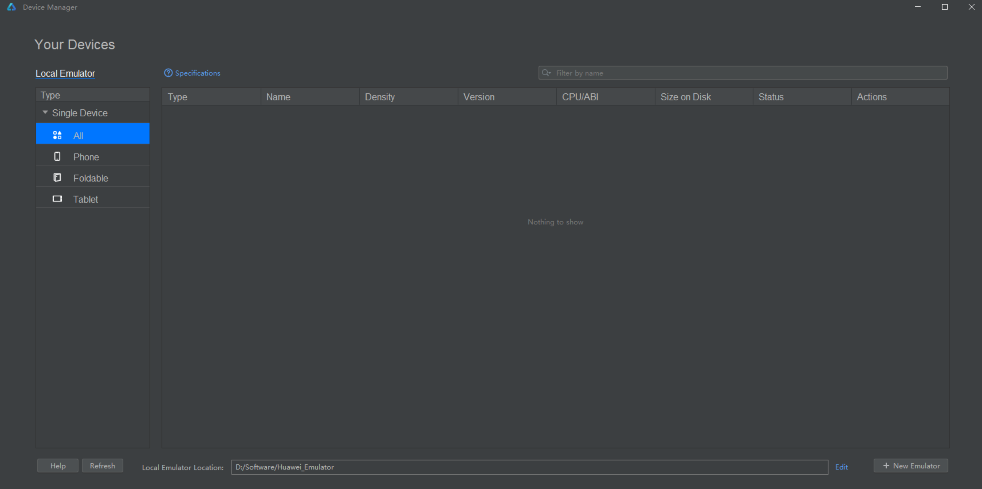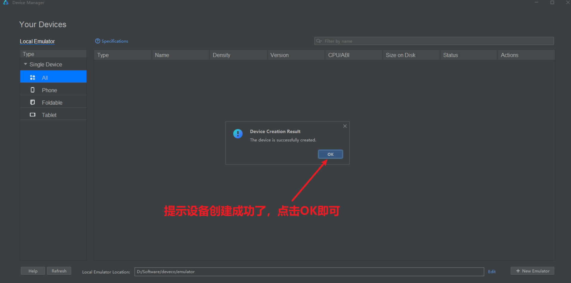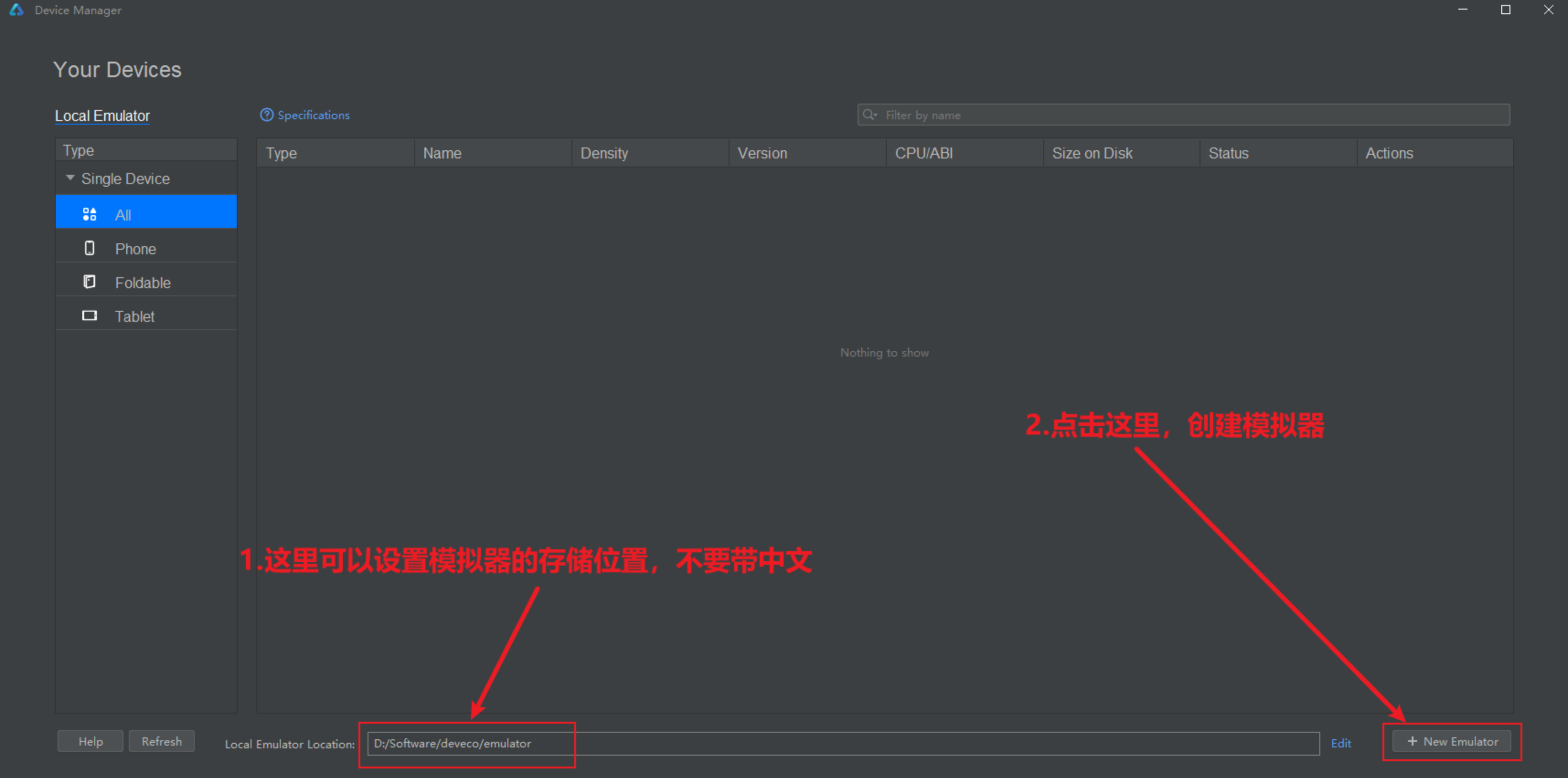 然后设置模拟器的存储位置(存储位置路径不要带中文),然后点击【+ New Emulator】按钮创建模拟器