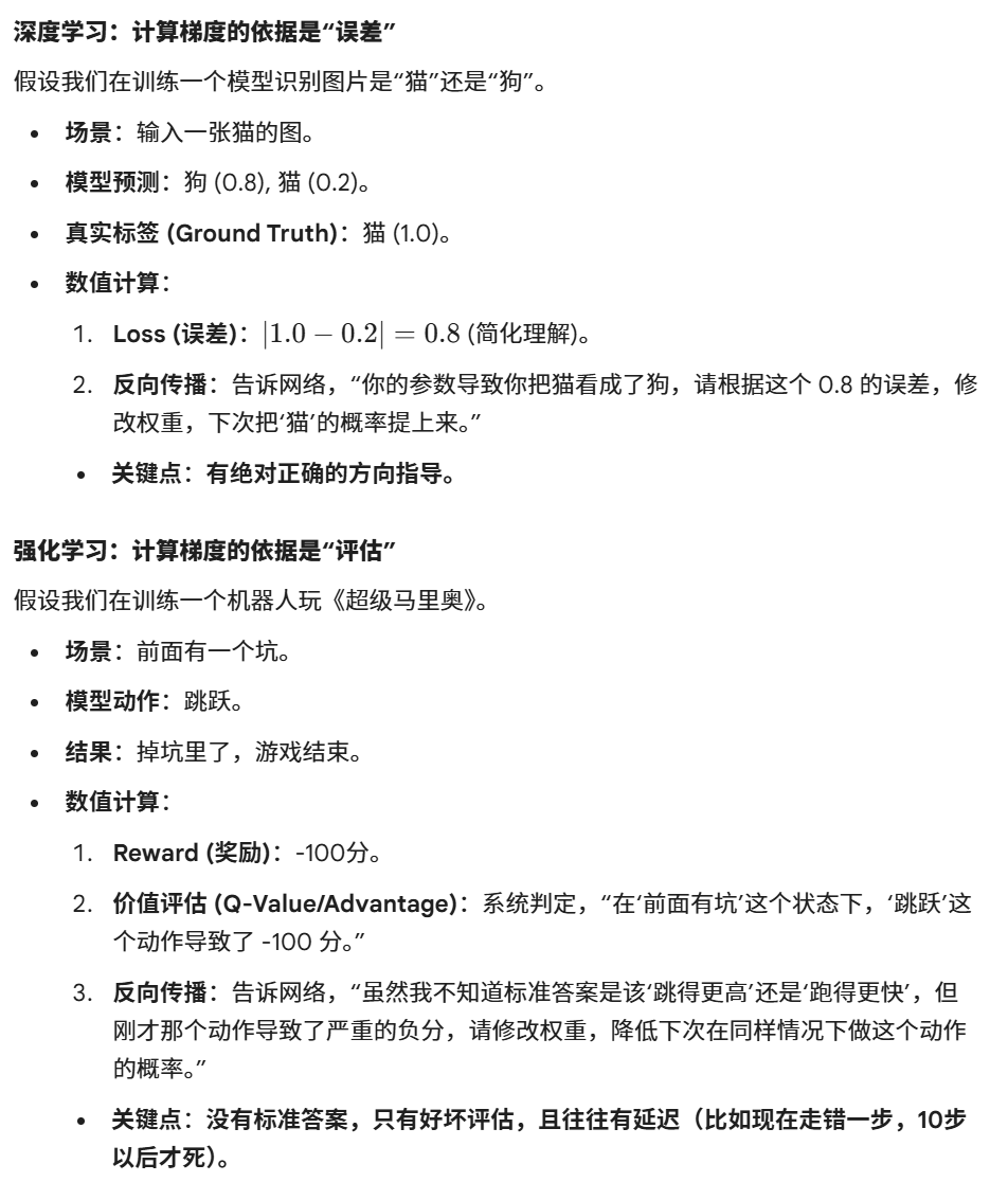 | 反馈机制 | 标准答案 (Label)。做完一道题,老师立刻告诉你"错了,选C",并打手心。 | 奖惩 (Reward)。走一步摔倒了(痛),走稳了(开心)。没人告诉你具体哪块肌肉用力不对,你自己悟。 |