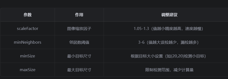 调整detectMultiScale函数的参数可以平衡检测精度和速度: