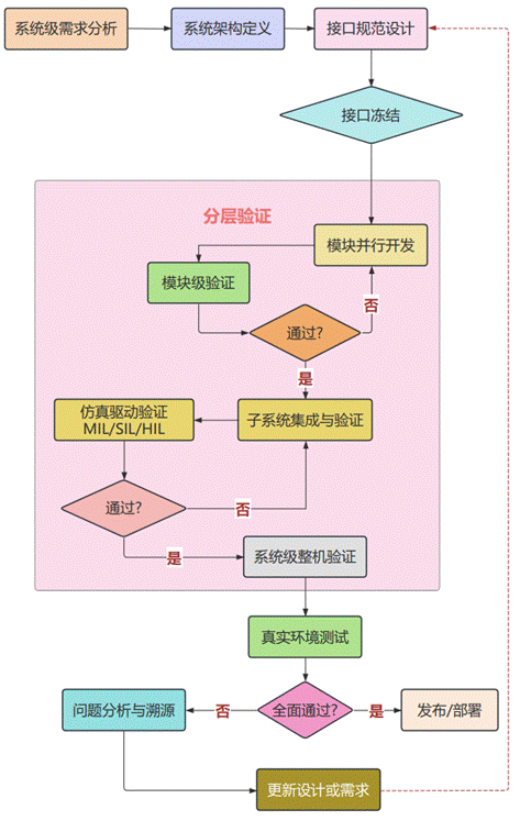 人形机器人系统具有模块数量多、学科交叉强、开发周期长等特点,若采用传统的串行开发模式,往往会导致集成阶段问题集中爆发,严重拖延项目进度。因此,在系统工程实践中,人形机器人通常采用并行开发与分层验证相结合的流程,在保证系统一致性的前提下提升整体研发效率,具体流程如图2-3所示。