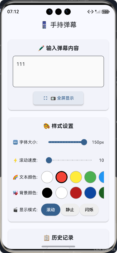 - 功能完整:实现了文本输入、样式设置、全屏显示、历史记录等核心功能