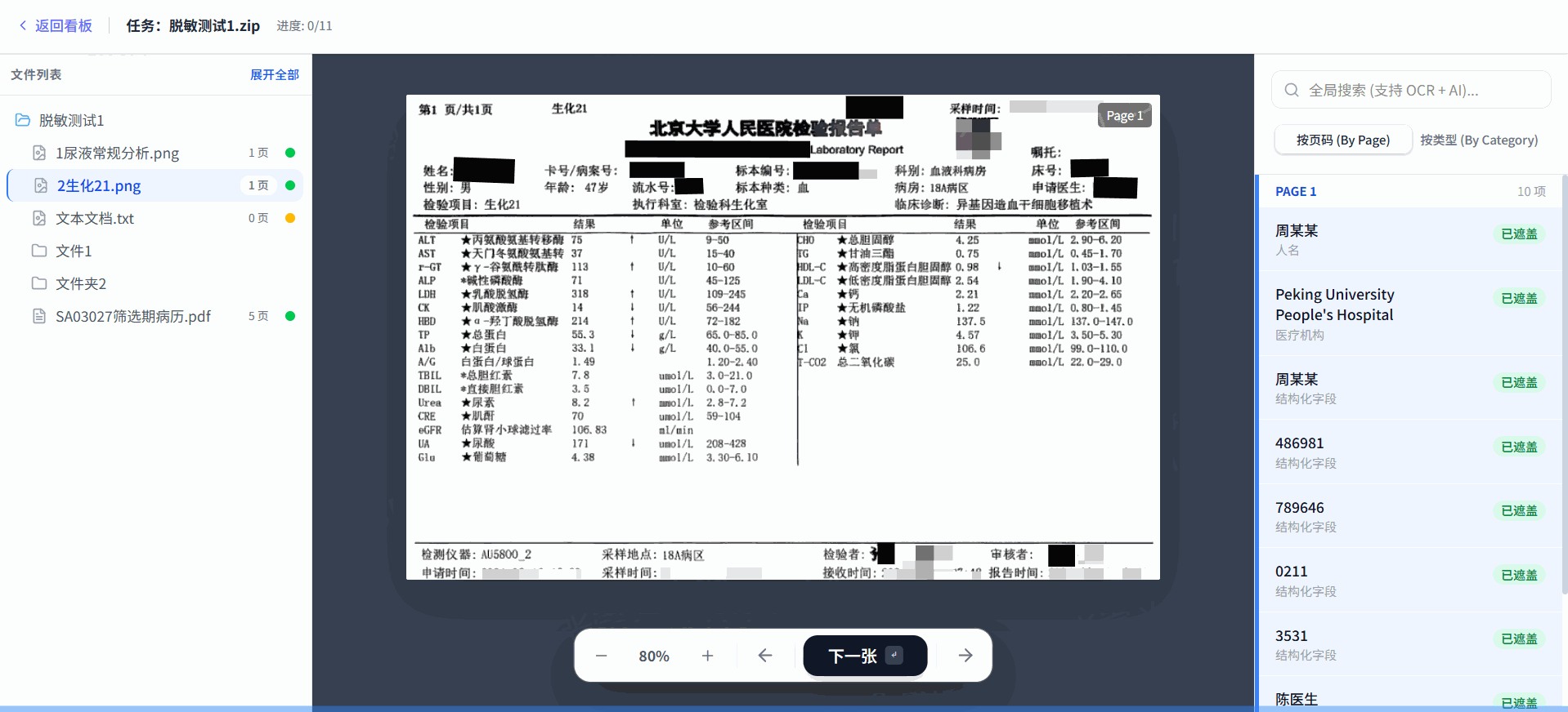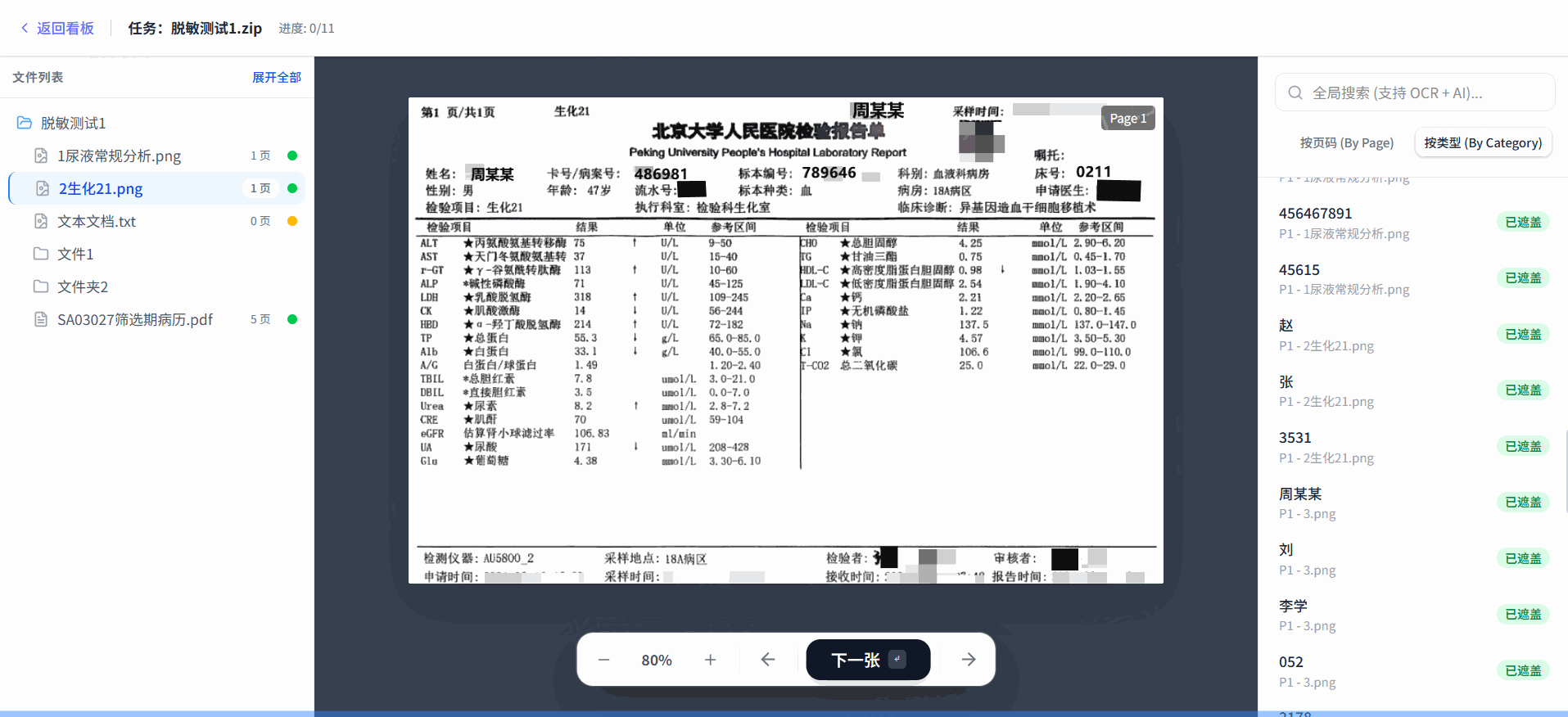 【全局搜索】搜索关键词相关的文本段,支持一键脱敏、取消脱敏。