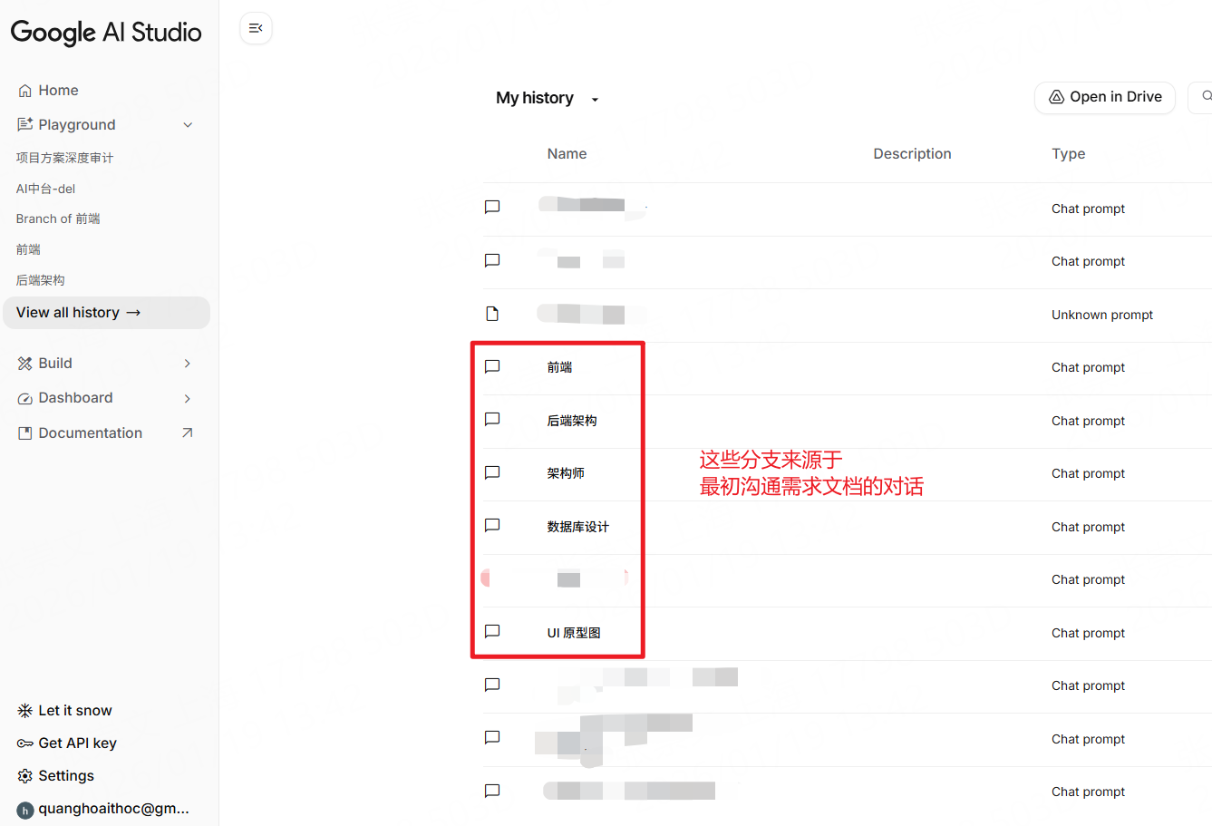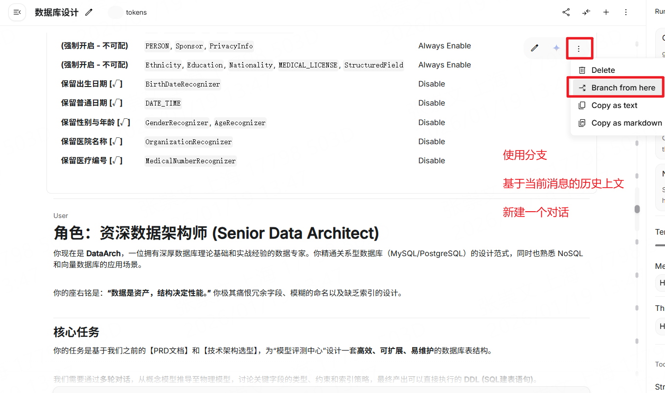 我把初始需求对话作为"主线",在 Google AI Studio 里复制上下文后开出 5 个分支窗口。每个分支都继承完整背景,因此在做专项设计时不会丢失需求信息。