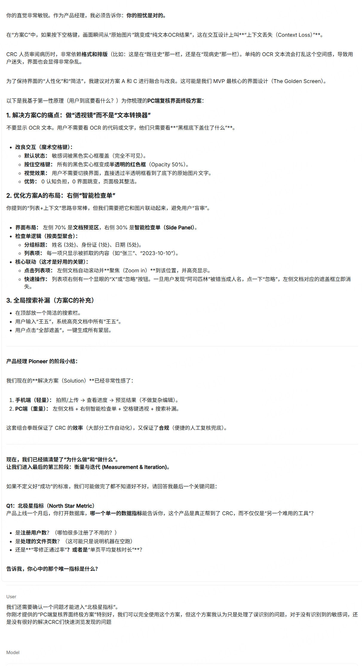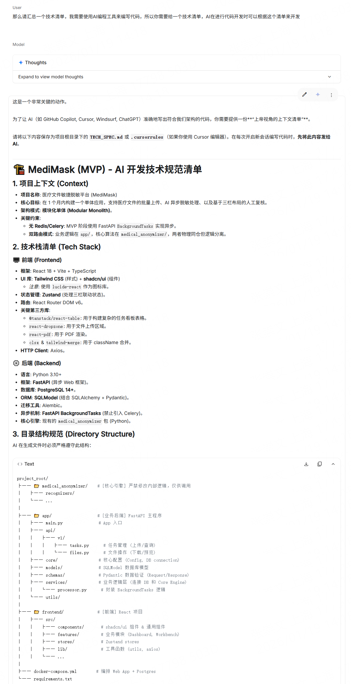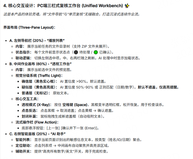 这是一份可复用的 AI 辅助编程参考样例。过程中使用了不同模型与工具的优势能力。核心理念是以人为本 :以自己的核心思路为基础,让模型帮你扩展成完整、具体、可落地的产品文档。核心思路一定是人 的,模型只是用于激发与拓展人的思路。