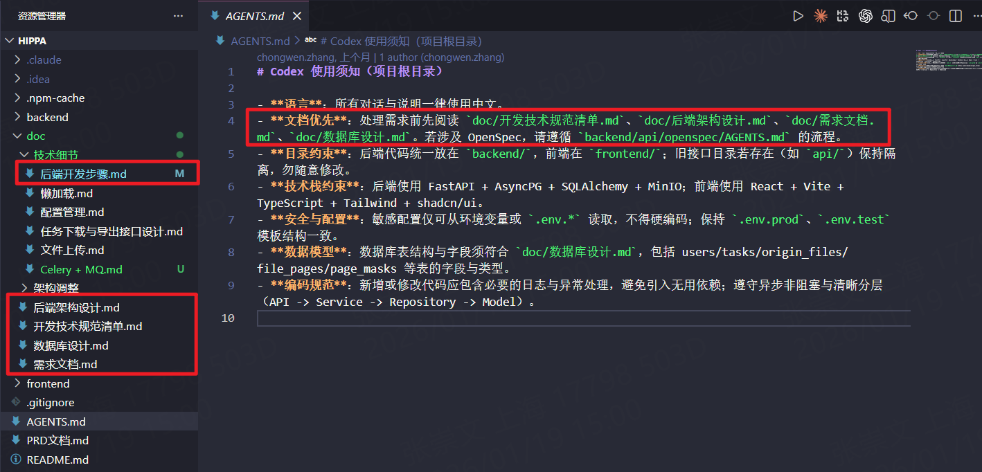 对话时会自动加载 《需求文档》 、《数据库设计文档》 、《开发技术规范清单》 、《后端架构设计文档》。