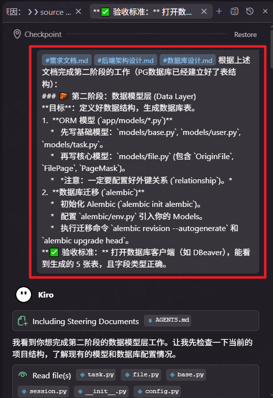 提示词比较简单,主要依赖前面准备好的文档,只需要给出《后端开发步骤文档》中的某个阶段即可。