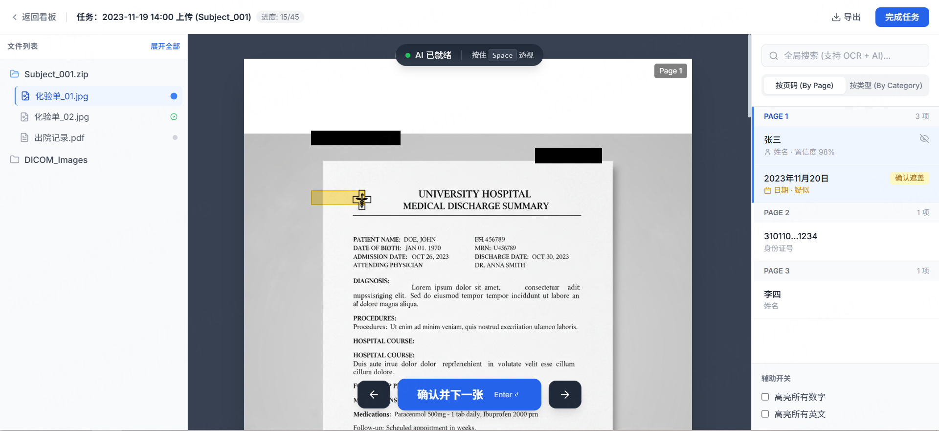 - 【双向交互】PDF切换页面,右侧跟随。右侧点击脱敏文本,画布跳转对应页面并闪烁。