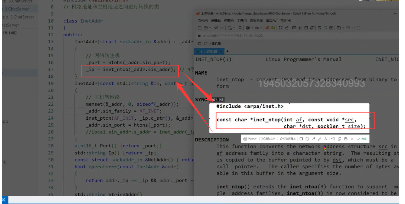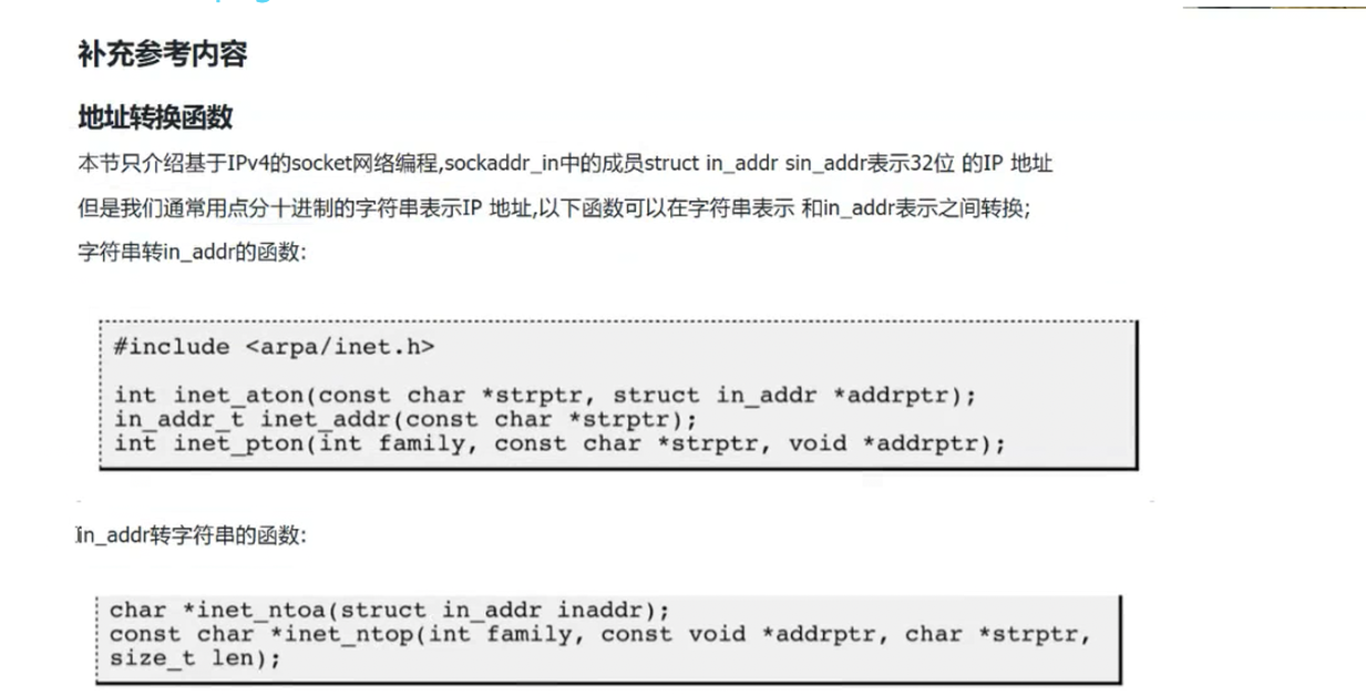 这些函数是网络编程中"IP格式互转"的核心工具,比如在bind()绑定IP前,需用inet_pton将字符串IP转为in_addr格式;在打印客户端IP时,需用inet_ntop将二进制地址转为可读字符串。