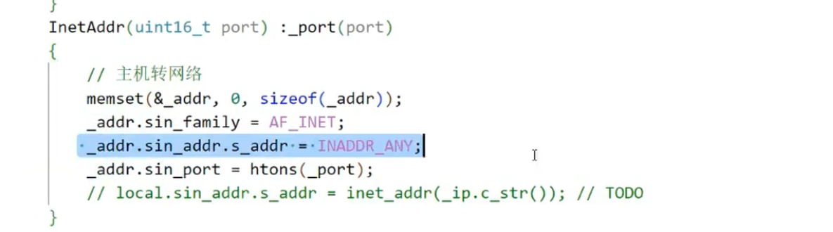 端口字节序转换:_addr.sin_port = htons(_port)将主机字节序的端口转换为网络字节序(网络通信的统一格式)。