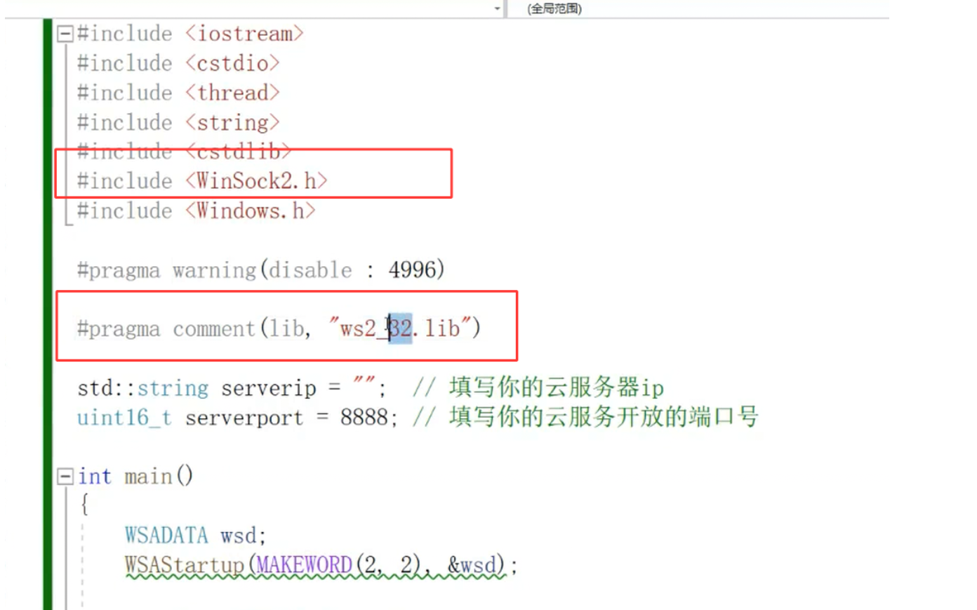 需引入WinSock2.h头文件(Windows 套接字 2 的 API 定义),并通过#pragma comment(lib, "ws2_32.lib")显式链接ws2_32.lib库(Windows 套接字的实现库);