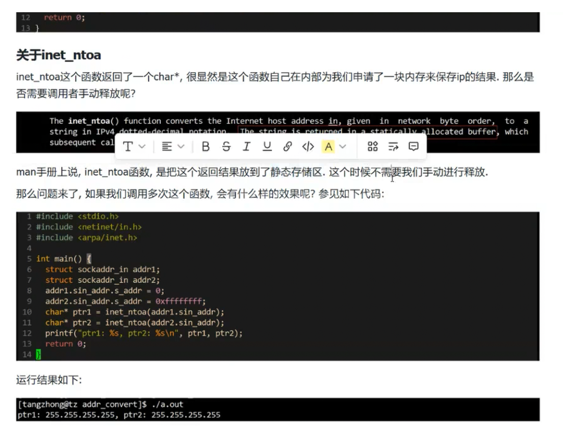 从man手册的说明可知,inet_ntoa会在内部申请一块静态存储区来保存转换后的 IP 字符串,因此调用者不需要手动释放内存。但这个设计会带来 "覆盖问题"------ 如果多次调用inet_ntoa,后续调用的结果会覆盖前一次的返回值。