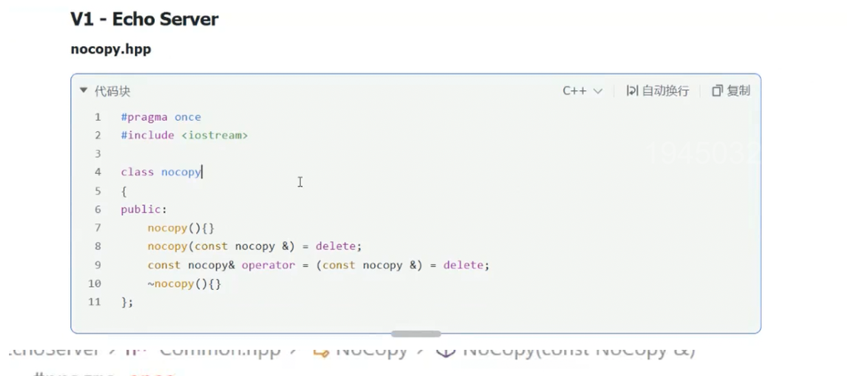 第 8 行:nocopy(const nocopy &) = delete; ------ 禁用拷贝构造函数,防止通过已有对象创建新的拷贝对象;