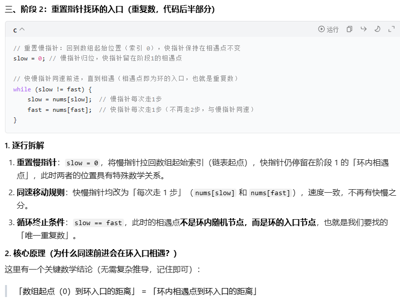 // 3. 步骤2:重置慢指针,找环的入口(重复数)