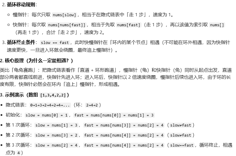 fast = nums[nums[fast]]; // 快指针每次走2步